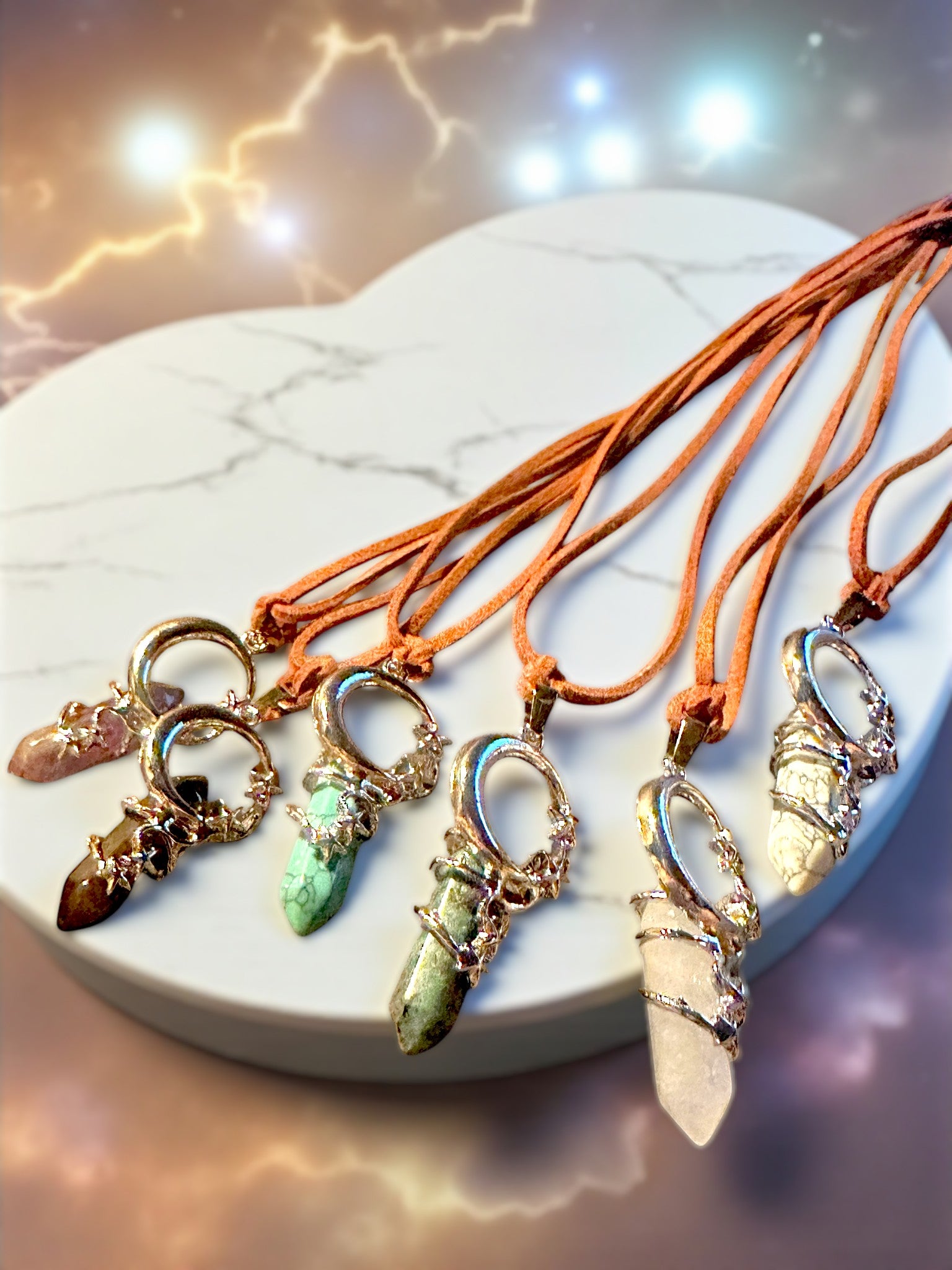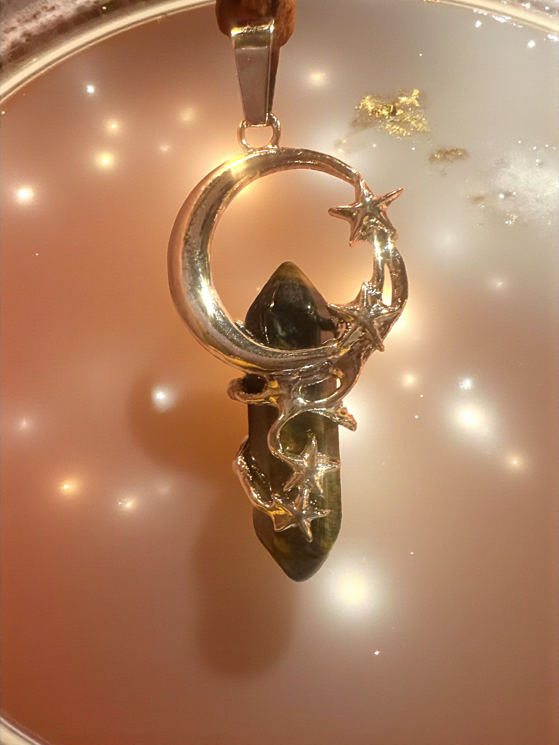 A celestial amulet of protection and wonder, this crescent moon and star pendant cradles a shimmering gemstone at its heart. Suspended from a soft brown suede cord, it carries the grounded warmth of earth and the luminous magic of the night sky—an enchanting talisman meant to inspire, protect, and guide its wearer.